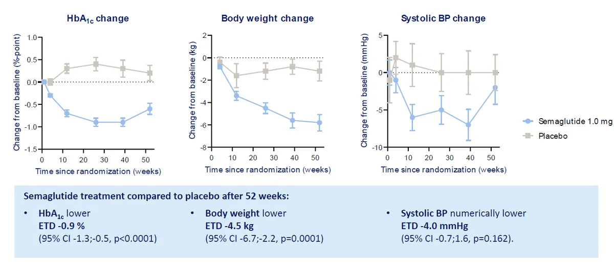 • Ensaio randomizado, 52 semanas, semaglutida 1,0 mg vs placebo.